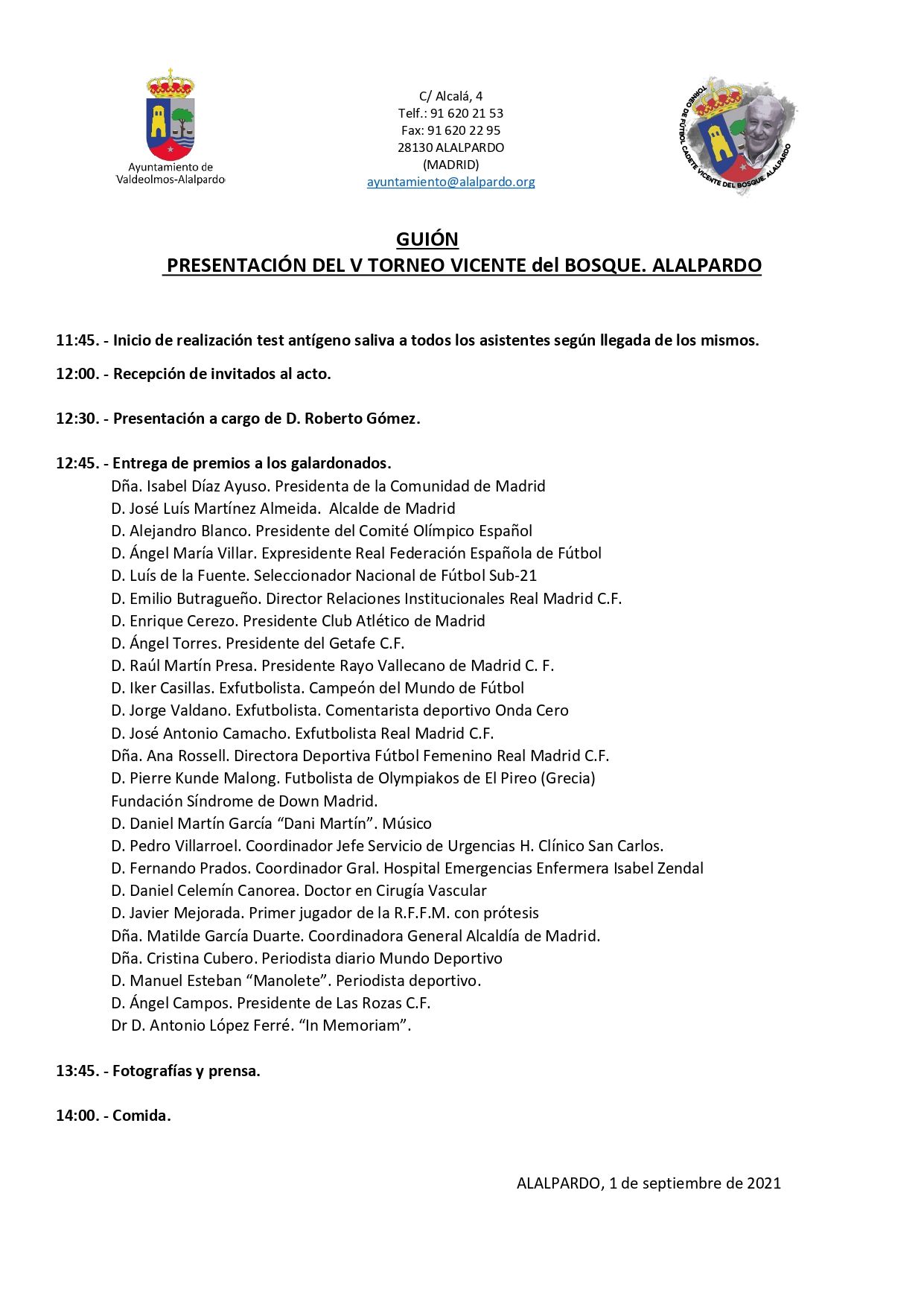 10 de septiembre: Presentación V Torneo de Fútbol Cadete Vicente del Bosque en la Sala Al-Artis