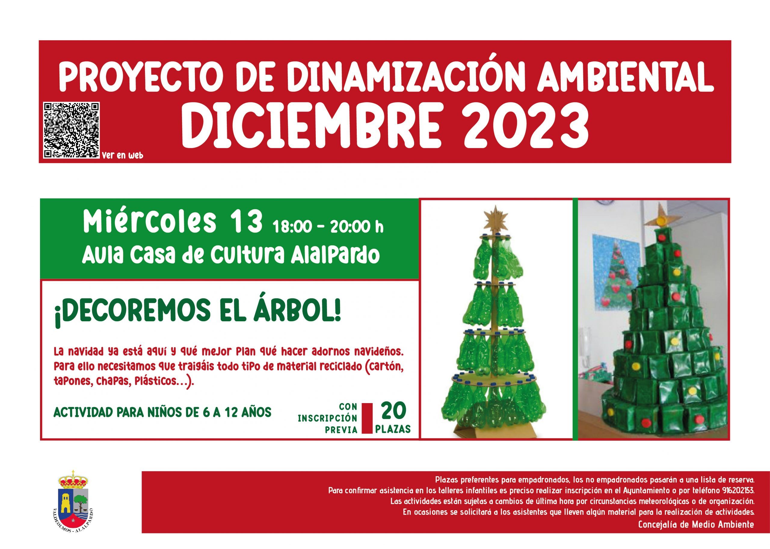 - Miércoles 13 de diciembre: ‘DECOREMOS EL ÁRBOL’ Taller en el Aula de la Casa de la Cultura de Alalpardo. Actividad para niñ@s de 6 a 12 años. 18:00 – 20:00 horas 20 plazas con inscripción previa.