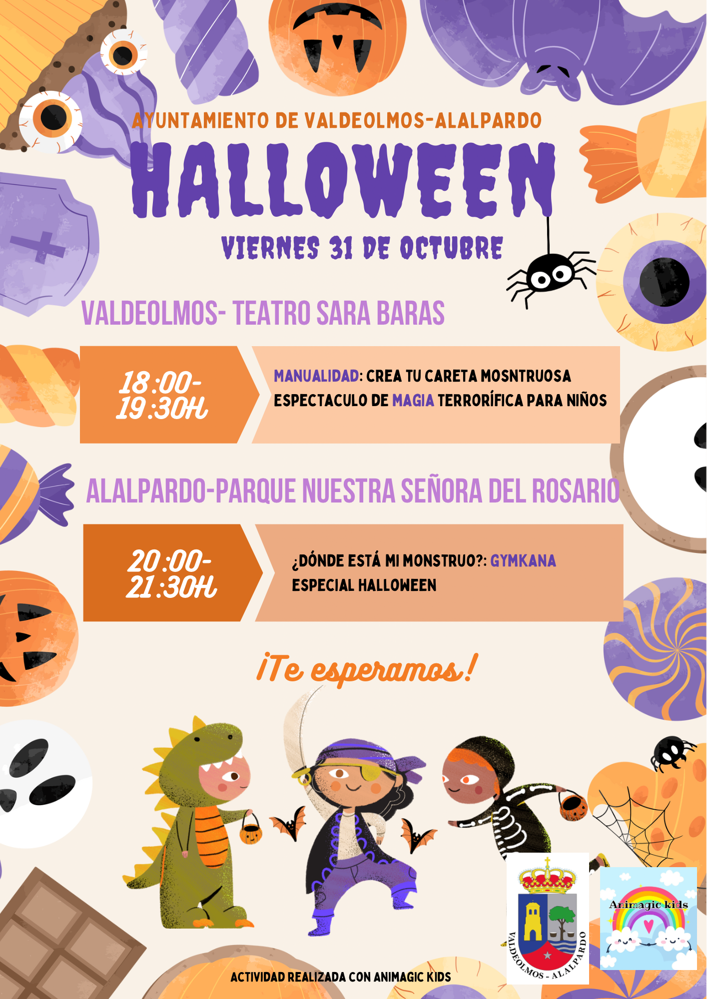 « Todos los Eventos 31 de octubre: Halloween en el municipio 31/10/2025 @ 18:00 - 21:30 Gratuito « 30 de octubre: Llega la Oficina de Empleo Móvil 5, 11 y 18 de noviembre: Llega la Oficina Municipal de Información al Consumidor » Celebra en el municipio la noche más terrorífica del año Te esperamos el 31 de octubre para disfrutar con las actividades organizadas por Animagic Kids Valdeolmos – Teatro Sara Baras De 18:00 a 19:30 horas Manualidad: Crea tu careta monstruosa Espectáculo de magia terrorífica para niños Alalpardo – Parque Nuestra Señora del Rosario De 20:00 a 21:30 horas Gymkana: ¿Dónde está mi monstruo? Especial Halloween + Google Calendar+ Agregar a iCalendar Detalles Fecha: 31/10/2025 Hora: 18:00 - 21:30 Precio: Gratuito Etiquetas del Evento:halloween, miedo, parque nuestra señora del rosario, tatro sara baras, terror Local Teatro-Estudio Sara Baras C/ Olivar 1, Valdeolmos 28130 + Google Map 2025-10-02