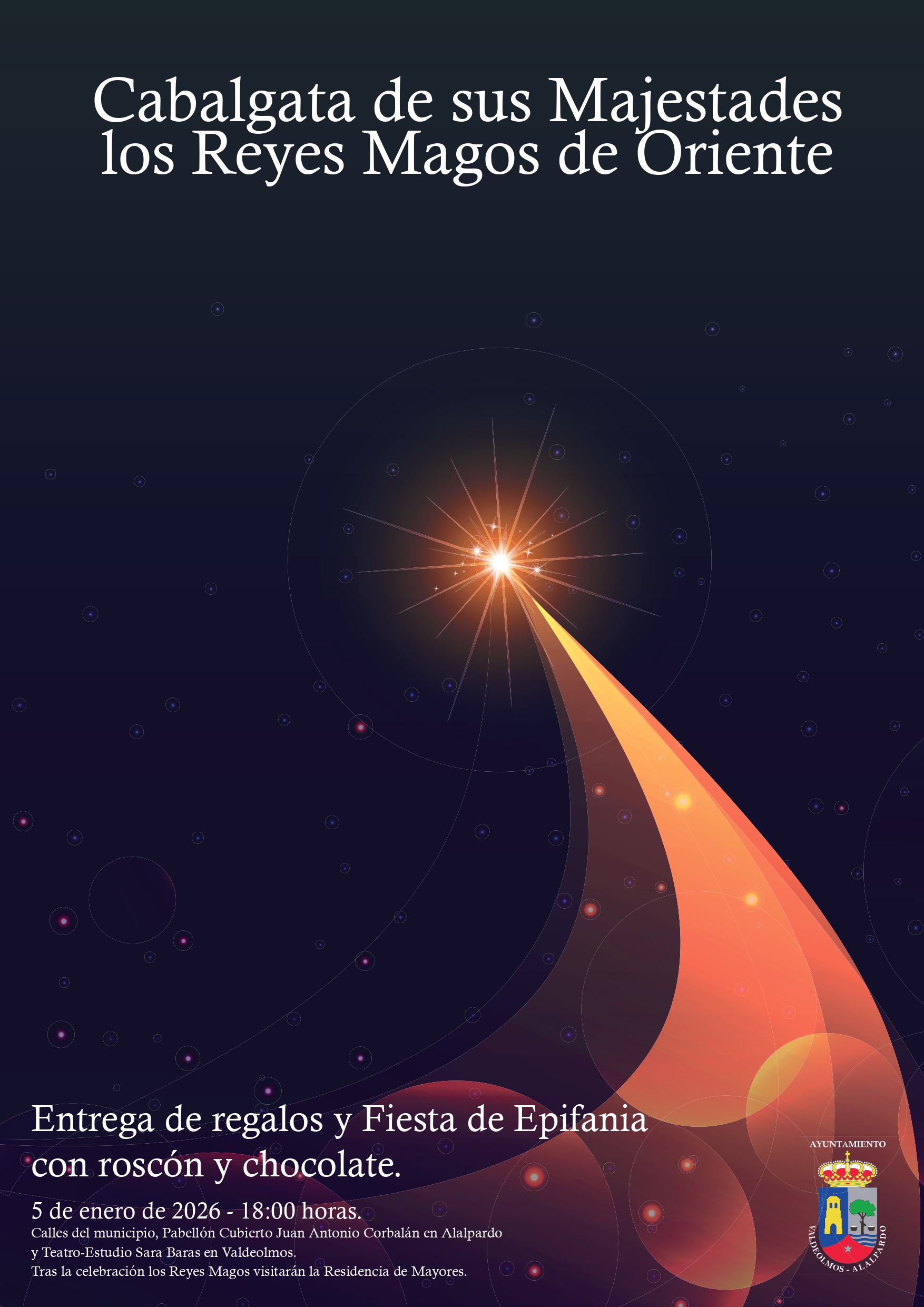 Cabalgata de sus Majestades los Reyes Magos por las calles del municipio y entrega de regalos más Fiesta de Epifanía y roscón y chocolate en el Pabellón Municipal Juan Antonio Corbalán en Alalpardo y Teatro-Estudio Sara Baras de Valdeolmos.