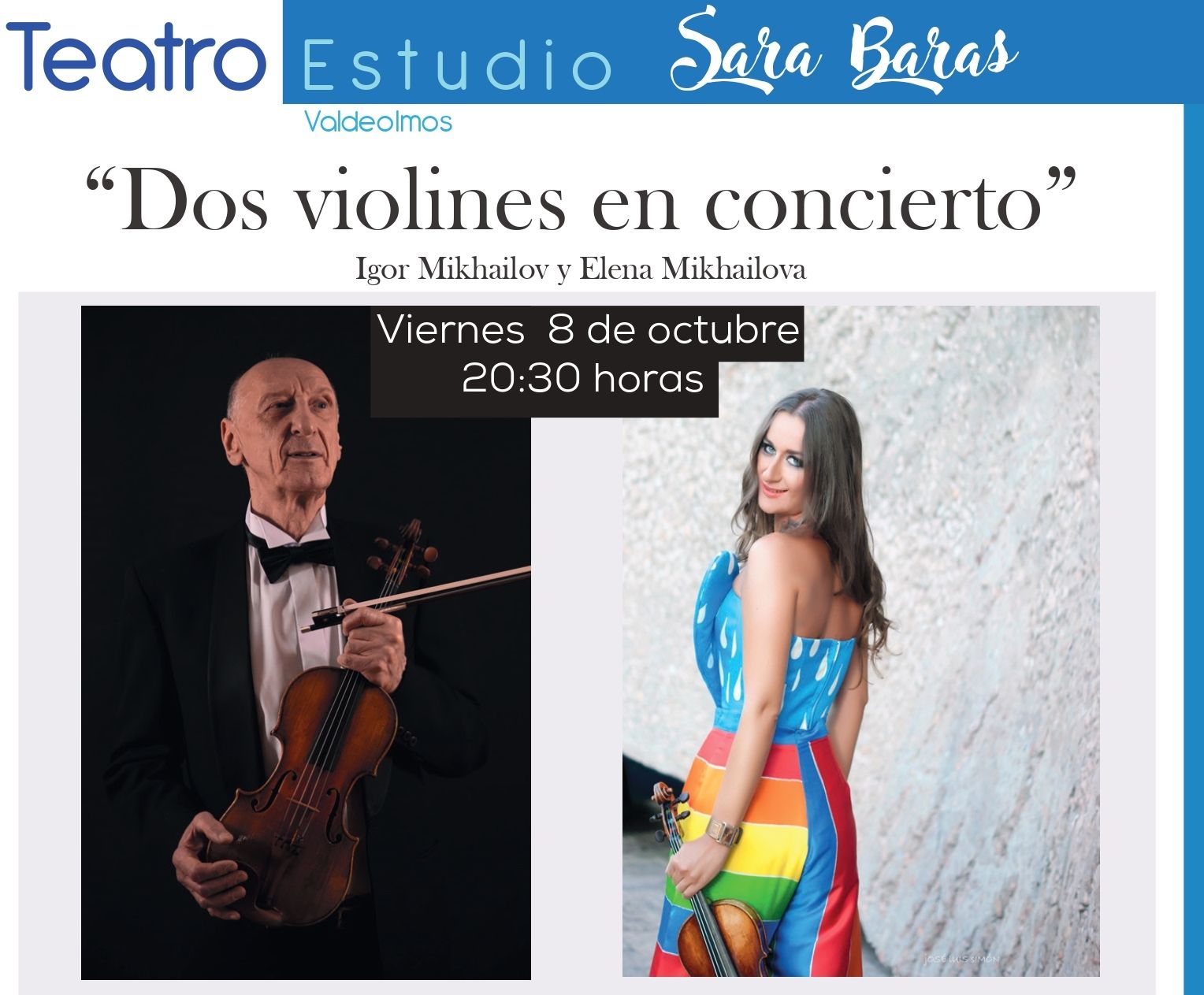 Igor Mikhailov nació en la antigua Unión Soviética. Con 6 años empezó sus estudios de violín y pertenece a la tercera generación de músicos profesionales. Actualmente trabaja en la Orquesta de la Comunidad de Madrid ORCAM. Elena Mikhailova es una de las violinistas más prestigiosas del mundo. Nació en Azerbaiyán aunque tiene nacionalidad española. Cuenta con más de 20 premios nacionales e internacionales. A los 6 años dio su primer concierto como solista en la Filarmónica de Bakú. Tocará con un violín del siglo XVIII.