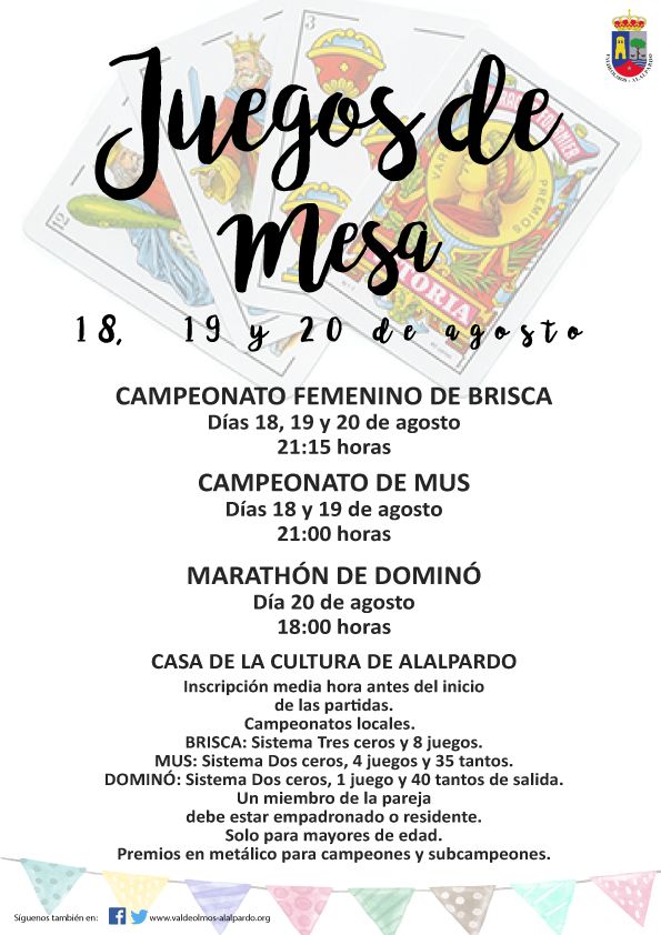 Torneo de Brisca, Mus y Dominó que se celebrarán los dias 18, 19 y 20 de agosto con motivo de las Fiestas Patronales de Alalpardo en honor a la Virgen del Rosario.