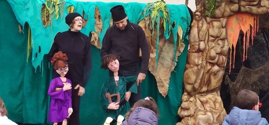 La Compañía de Títeres ‘Sol y Tierra’ improvisó un teatro en el exterior de la nueva Casa de la Cultura de Valdeolmos. Cultura al aire libre y segura en tiempos de covid.