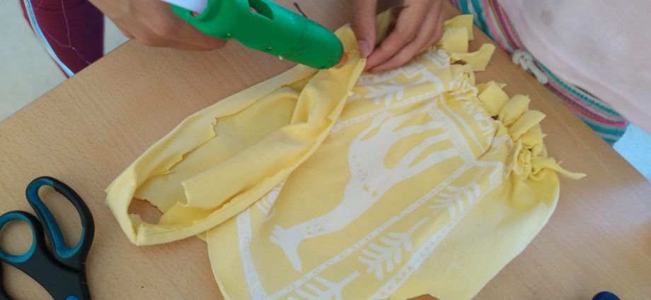 Jóvenes de entre 8 y 16 años crearon bolsas de la compra para reducir el consumo de bolsas de plástico. Utilizaron camisetas viejas, silicona, tijeras y mucha imaginación para lograr alegres bolsas para ir a la compra.