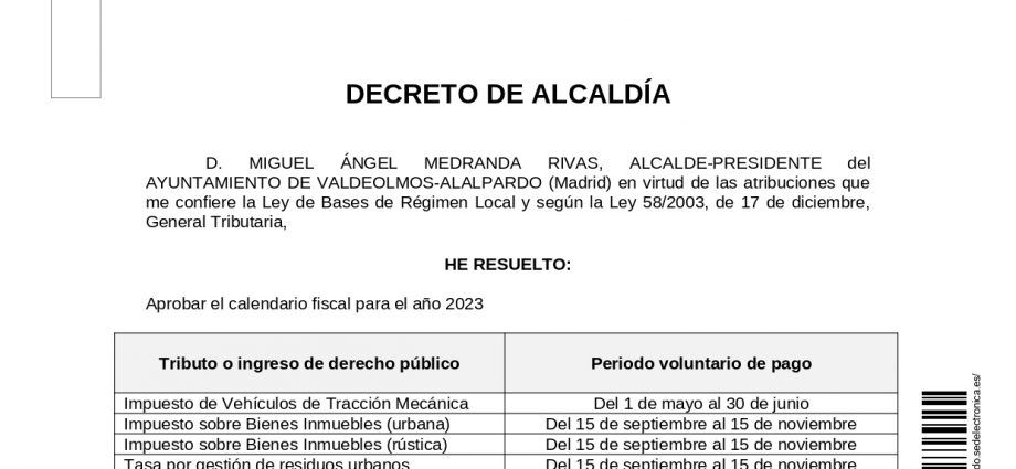 Decreto de Alcaldía con el Calendario Fiscal del año 2023