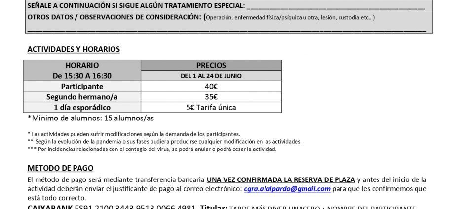 Se adjunta el Formulario de Extraescolares tarde y Diver junio. Inscripciones hasta el 27 de mayo.