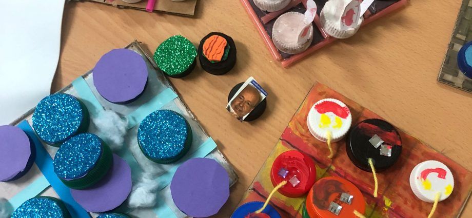 Son los juegos de mesa que hicieron el 22 de noviembre con chapas y tapones, cartón, pegamento, tijeras, goma eva y mucha creatividad.