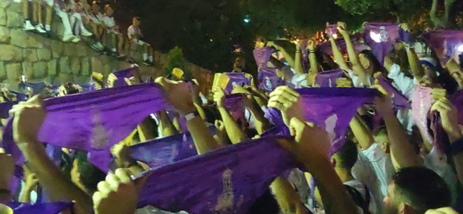 Los miembros de la Peña, vestidos de blanco y morado, siempre llevan el pañuelo atado a la muñeca. Tras la imposición al santo, se lo colocan también en el cuello.