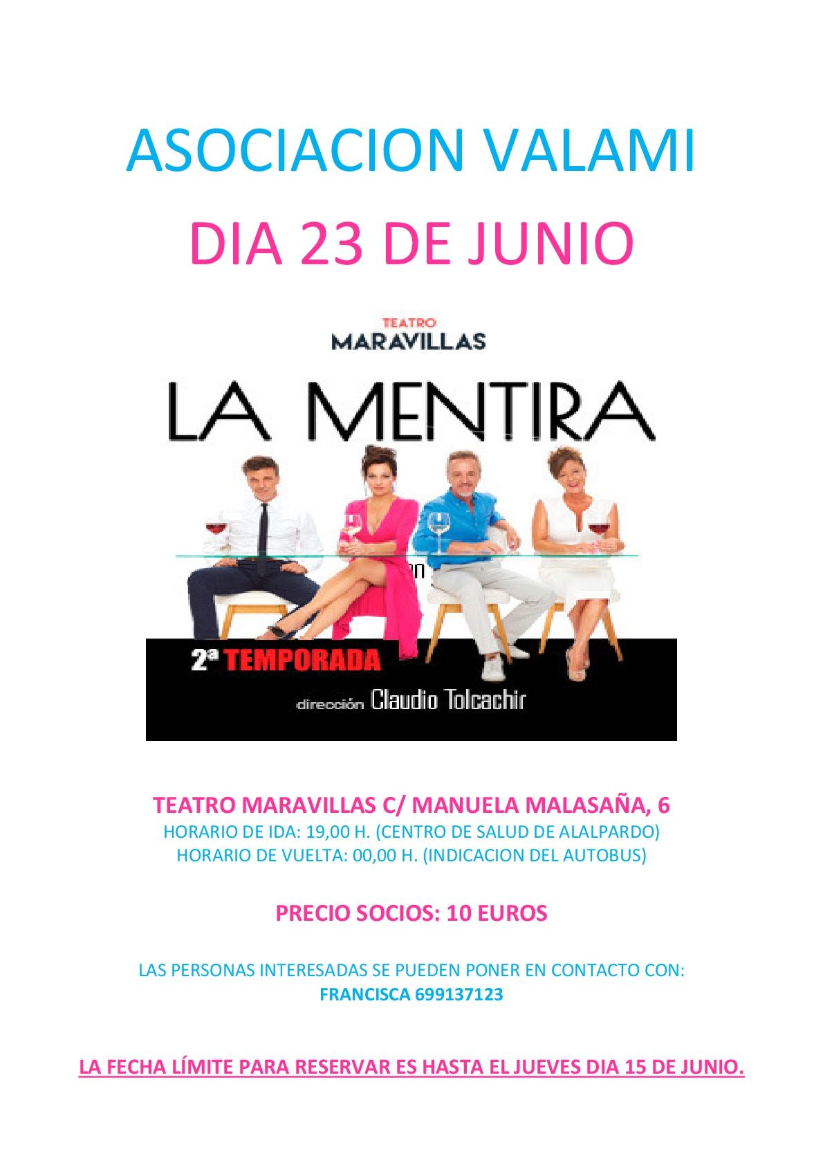 ¿Te vienes al teatro el 23 de junio? La Asociación Valami te lleva al Teatro Maravillas a ver ‘La Mentira’. El precio para socios es de 10 euros.