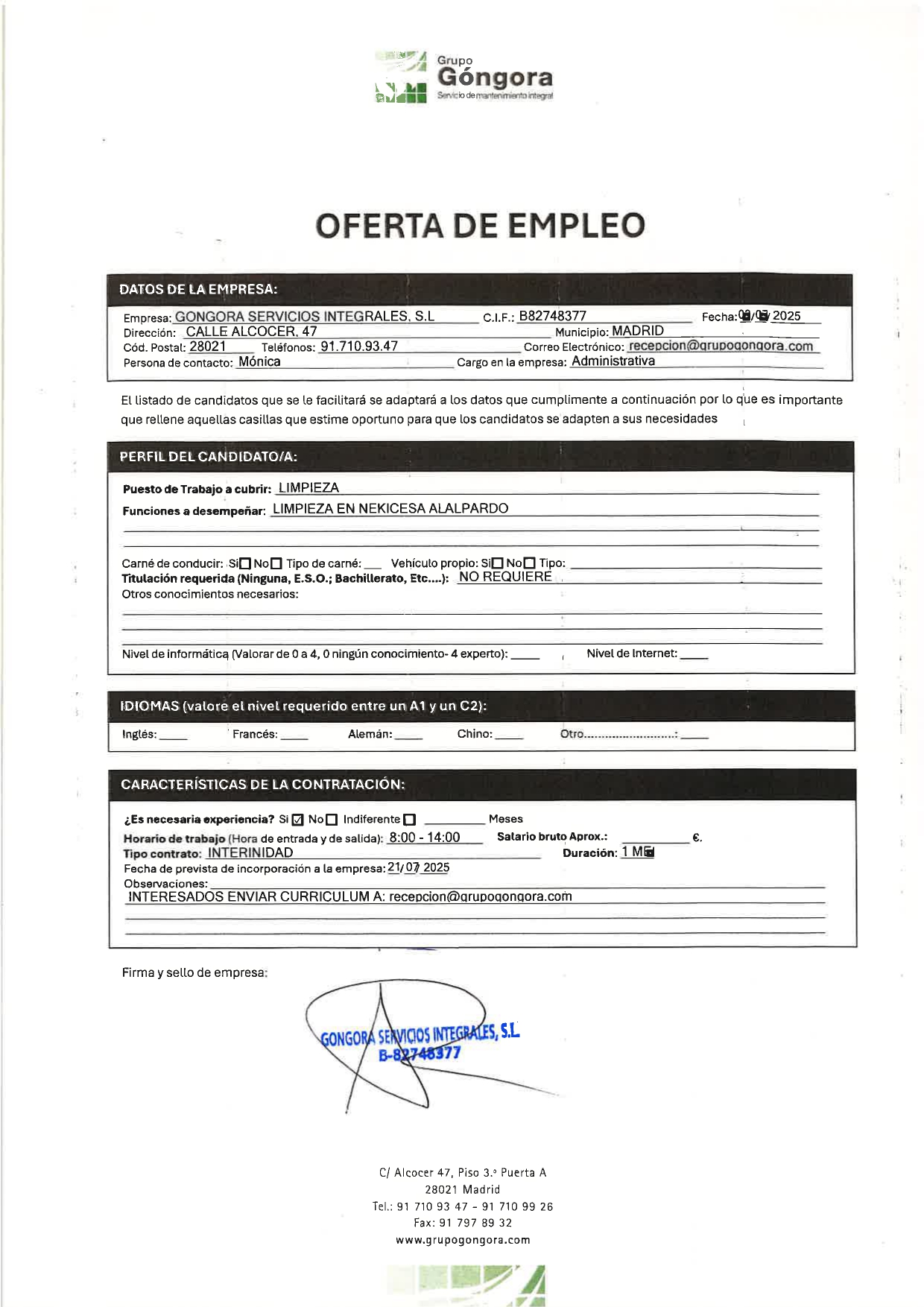 Oferta de empleo: Limpieza en Nekicesa Alalpardo