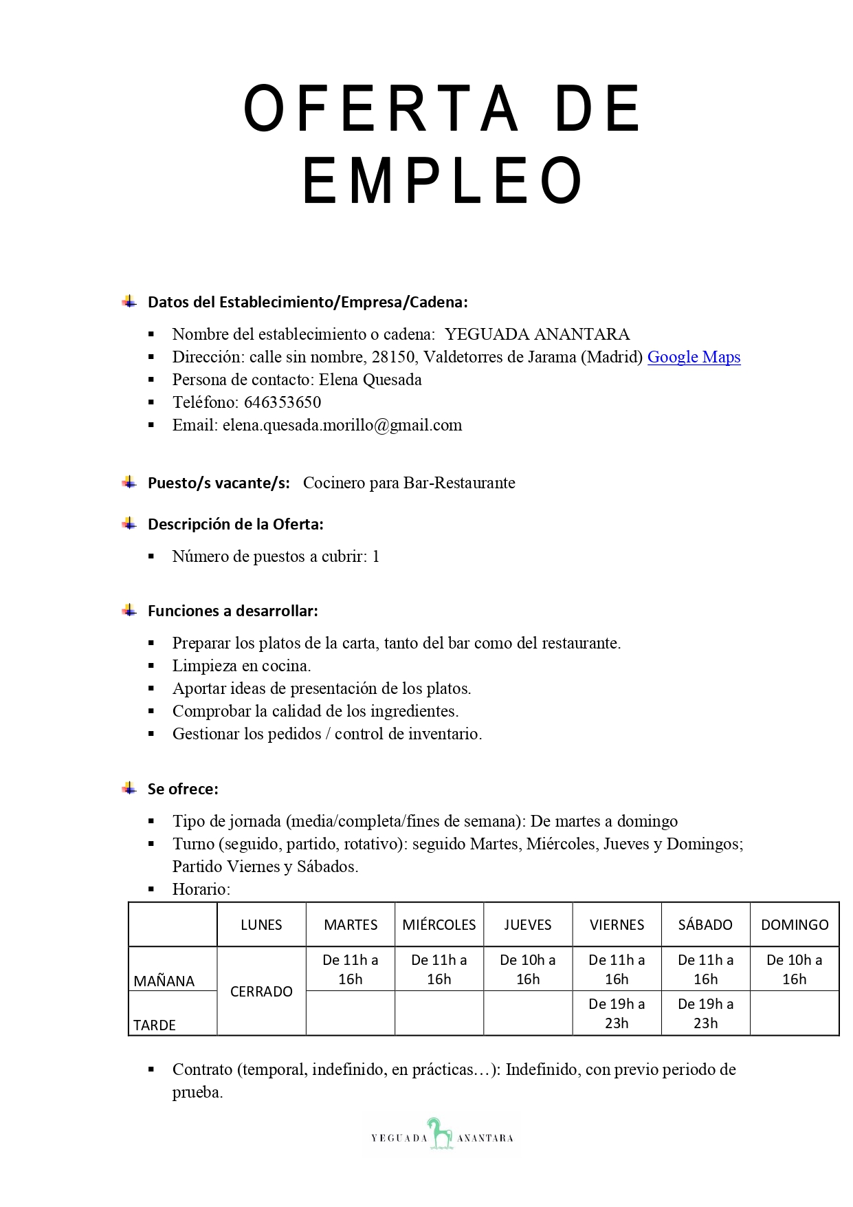 Oferta de empleo: Yeguada Anantara precisa cociner@ y camarer@ »