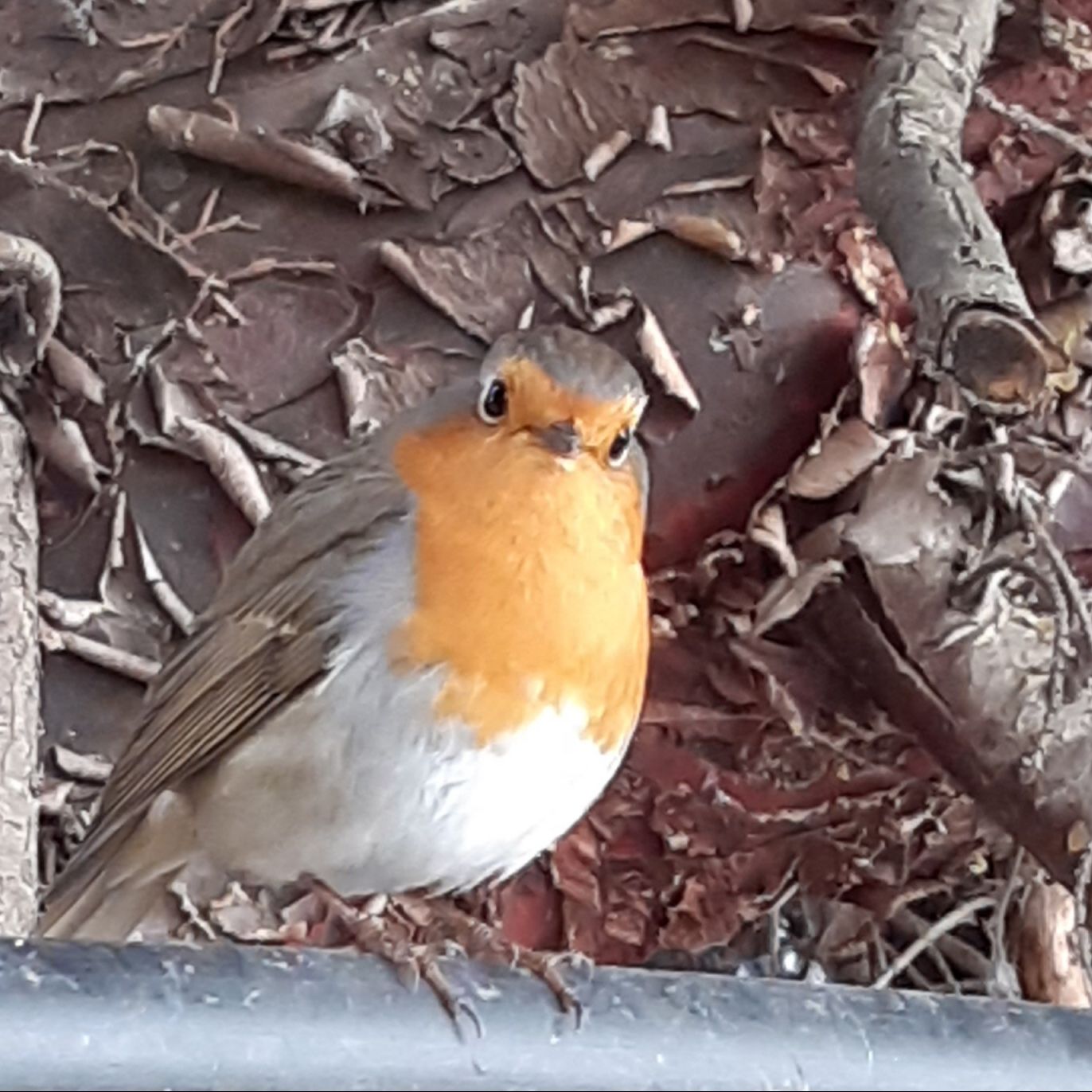 Se trata de un Petirrojo Europeo cuyo nombre científico es Erithacus rubecula. Es un ave de silueta rechoncha y pecho bermejo muy poco tímido. Es de los primeros que canta al amanecer y tiene un canto precioso.