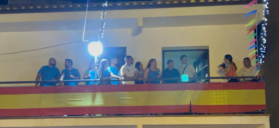 En el balcón la Comisión de Fiestas, el Alcalde y el Padre Jaime que cantó una canción muy especial