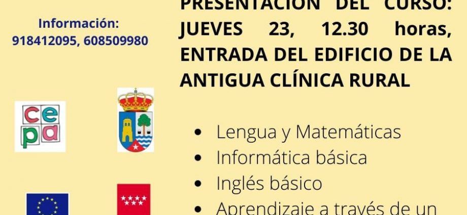 El jueves 23 de septiembre a las 12:30 horas se presentará el Curso 2021/2022 de Formación de Adultos en la entrada del edificio de la la antigua clínica rural.