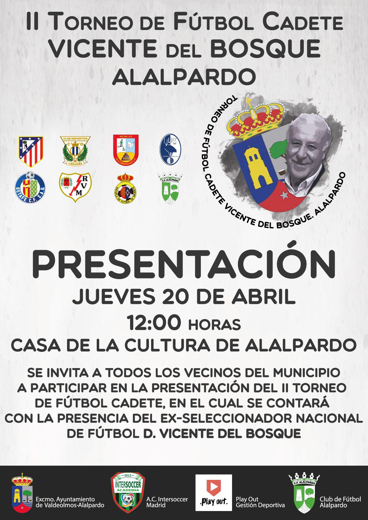 Se invita a todos los vecinos del municipio a la presentación del II Torneo de Fútbol Cadete Vicente del Bosque. Al acto acudirá D. Vicente del Bosque, el ex seleccionador nacional de fútbol. Será el 20 de abril en la Casa de la Cultura de Alalpardo a las 12:00 horas.