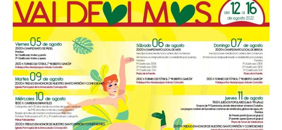 Las Fiestas en honor del Santísimo Cristo atado a la Columna se celebran en Valdeolmos del 12 al 16 de agosto pero desde el 5 de agosto empezamos a calentar motores con campeonatos de pádel, torneo de fútbol 7, carreras infantiles y masterclass de zumba.