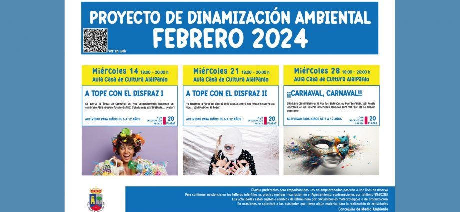 - Miércoles 14 de febrero: ‘A TOPE CON EL DISFRAZ I’ Taller en el Aula de la Casa de la Cultura de Alalpardo. Actividad para niñ@s de 6 a 12 años. 18:00 – 20:00 horas 20 plazas con inscripción previa.