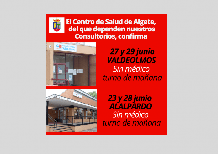 El Centro de Salud de Algete, del que dependen nuestros Consultorios, confirma que no habrá médico en turno de mañana en el Consultorio de Alalpardo el 23 y 28 de junio. En Valdeolmos también en turno de mañana, 27 y 29 de junio.