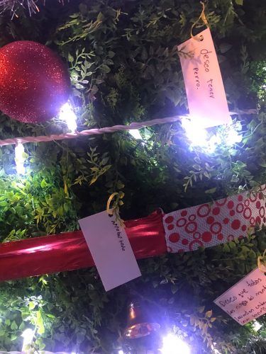 Los niños escribieron sus deseos y los colgaron en los dos Árboles de Navidad colocados en la Plaza Nacional de Valdeolmos y en la Calle Alcalá 1 de Alalpardo. Las Tejedoras del Paeque los tejieron el año pasado durante 9 meses utilizando 90.000 metros de lana.