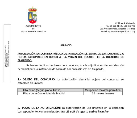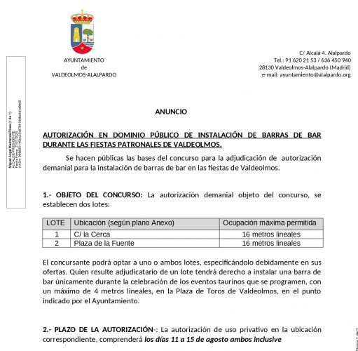 Bases del Concurso adjudicación de autorización demanial – barras de bar Fiestas Valdeolmos y Alalpardo
