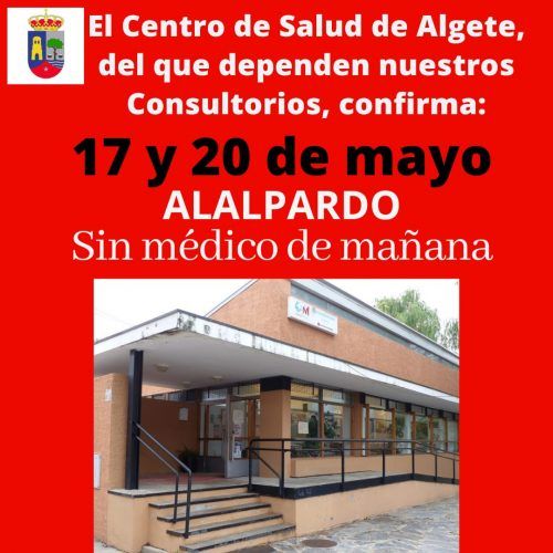El Centro de Salud de Algete, del que dependen nuestros Consultorios, confirma que el 17 y 20 de mayo no habrá médico en Alalpardo en turno de mañana.