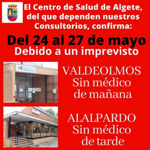 El Centro de Salud de Algete, del que dependen nuestros Consultorios, confirma que debido a un imprevisto, del 24 al 27 de mayo no habrá médico en Valdeolmos en turno de mañana y en Alalpardo en turno de tarde.