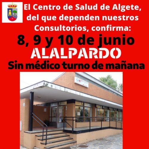 El Centro de Salud de Algete, del que dependen nuestros Consultorios, confirma que no habrá médico en Alalpardo en turno de mañana 8, 9 y 10 de junio.