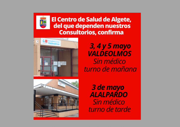 El Centro de Salud de Algete, del que dependen nuestros Consultorios, confirma que no habrá médico en turno de mañana en el Consultorio de Valdeolmos los días 3, 4 y 5 de mayo. Tampoco el 3 de mayo en turno de tarde en Alalpardo.