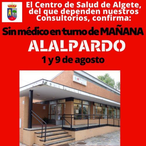 El Centro de Salud de Algete, del que dependen nuestros Consultorios, confirma que por falta de profesionales, no habrá médico en Alalpardo en turno de mañana los días 17, 19, 22, 29, 31 de agosto y 2 de septiembre.