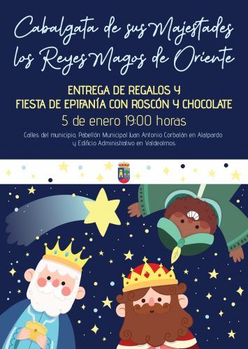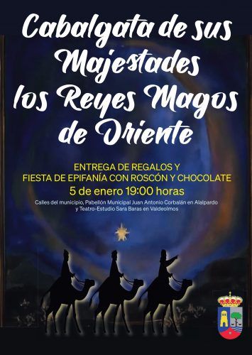 Cabalgata de sus Majestades los Reyes Magos por las calles del municipio y entrega de regalos más Fiesta de Epifanía y roscón y chocolate en el Pabellón Municipal Juan Antonio Corbalán en Alalpardo y Teatro-Estudio Sara Baras de Valdeolmos.