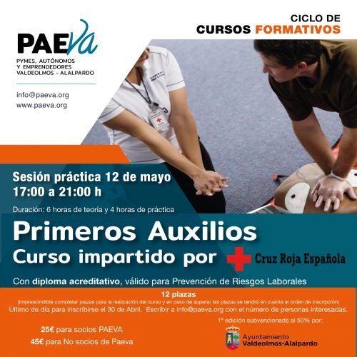 Curso de Primeros Auxilios impartido por Cruz Roja, con diploma acreditativo y compatible con la Ley de Prevención de Riesgos Laborales.