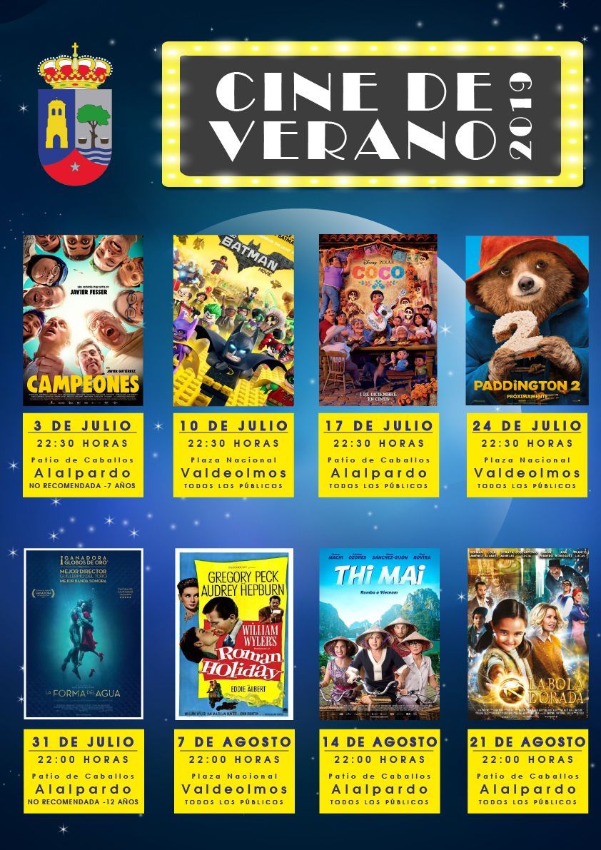 Desde el 3 de julio hasta el 21 de agosto. CAMPEONES, BATMAN, COCO, PADDINTON 2, LA FORMA DEL AGUA, ROMAN HOLIDAY, THI MAI, LA BOLA DORADA.