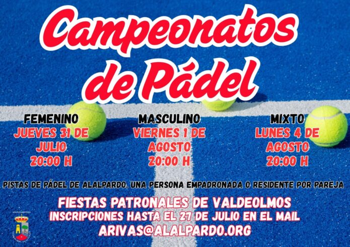 31 de julio, 1 y 4 de agosto: Campeonato de Pádel – Fiestas Patronales de Valdeolmos