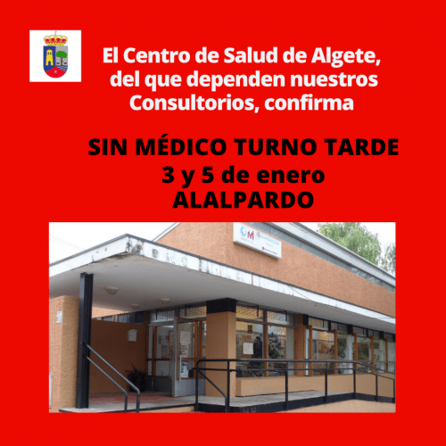 El Centro de Salud de Algete del que dependen nuestros Consultorios, confirma que del 13 al 16 de diciembre no habrá médico en turno de mañana en Alalpardo.