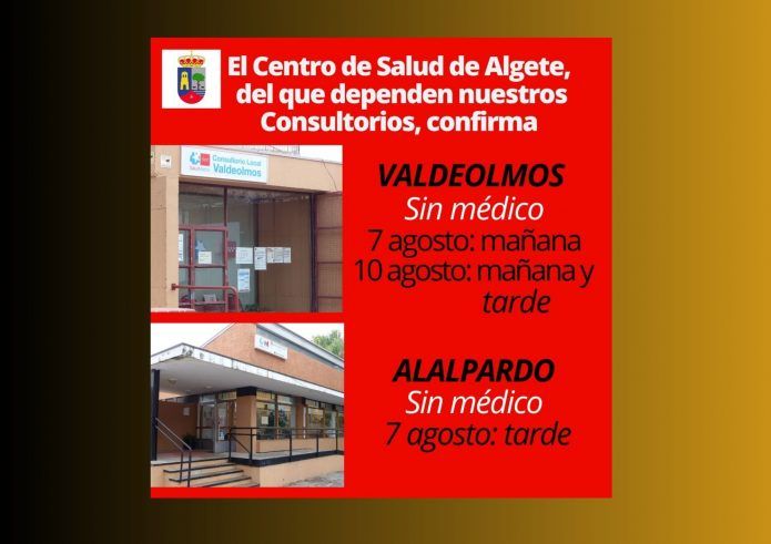 El Centro de Salud de Algete, del que dependen nuestros Consultorios, confirma que no habrá médico el 7 de agosto en turno de mañana en el Consultorio de Valdeolmos ni en Alalpardo en turno de tarde. El 10 de agosto no habrá médico en Valdeolmos ni de mañana ni tarde.