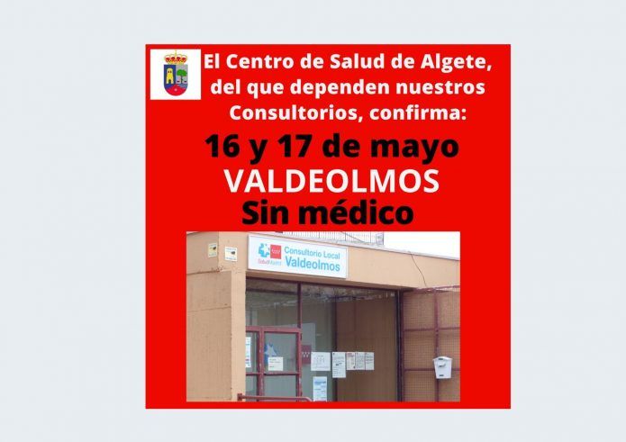El Centro de Salud de Algete del que dependen nuestros Consultorios, confirma que no habrá médico en Valdeolmos el 14 de junio.