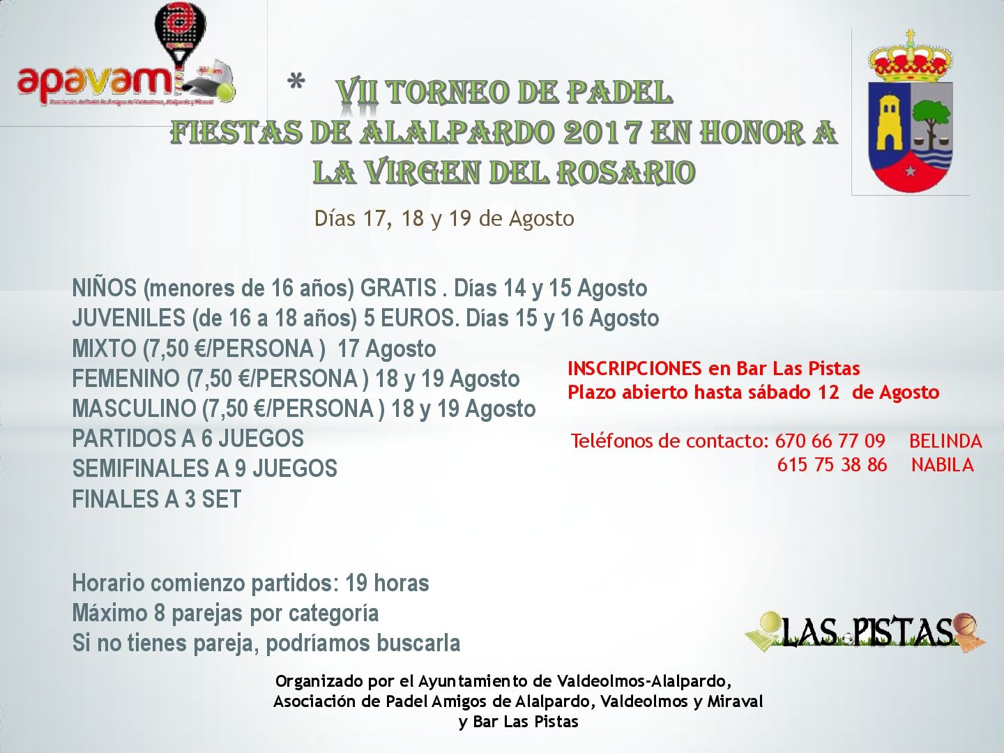 ¡Apúntate al V Torneo de Padel con motivo de las Fiestas Patronales de Alalpardo! Se disputará del 14 al 19 de agosto. Inscripción en Bar Las Pistas.